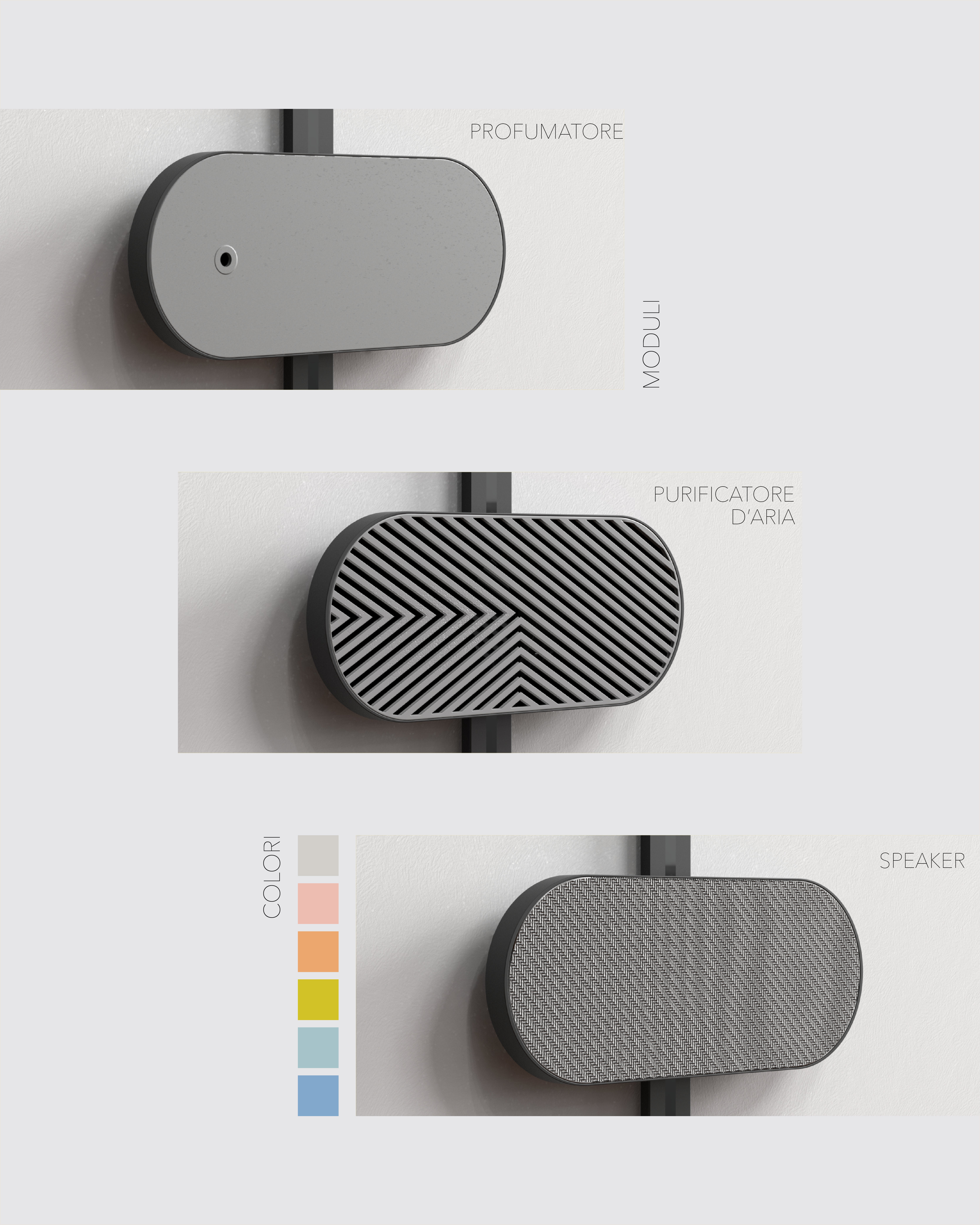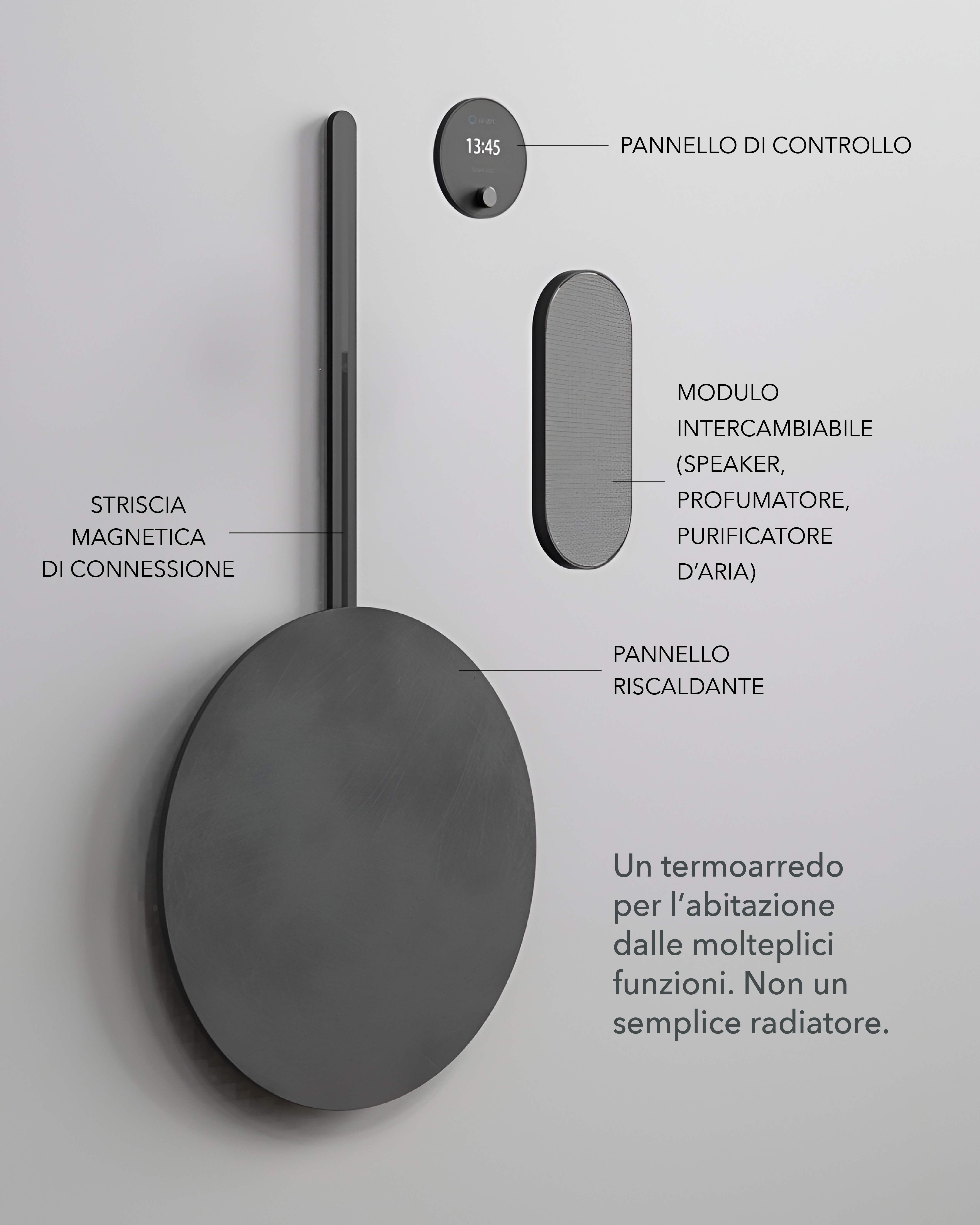 Un elemento verticale che integra riscaldamento, controllo e moduli accessori in un unico sistema discreto e configurabile. La personalizzazione del prodotto si eleva con i suoi moduli che possono fungere da purificatore d’aria, speaker e diffusore di profumi. Grazie alla palette colori varia è possibile scegliere il colore che meglio corrisponde alle proprie esigenze estetiche.